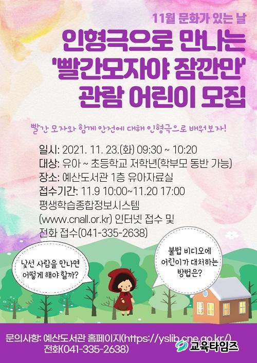¡¸»¡°£¸ðÀÚ¾ß Àá±ñ¸¸¡¹Àº 11¿ù 23ÀÏ, ¿ÀÀü 9½Ã ¹ÝºÎÅÍ 10½Ã 20ºÐ±îÁö ¿¹»êµµ¼°ü 1Ãþ À¯¾ÆÀÚ·á½Ç¿¡¼ ÁøÇàµÉ ¿¹Á¤À̸ç, µ¿È '»¡°£ ¸ðÀÚ'¸¦ °¢»öÇÏ¿© ³¸¼± »ç¶÷À» ¸¸³µÀ» ¶§ ¾î¸°À̰¡ ´ëóÇÏ´Â ¹æ¹ý µîÀÇ ¾ÈÀü¿¡ °üÇÑ ³»¿ëÀ» ¹è¿ï ¼ö ÀÖµµ·Ï ÇÏ´Â ³»¿ëÀÌ´Ù. 11¿ù 9ÀÏ È¿äÀÏ ¿ÀÀü 10½ÃºÎÅÍ 11¿ù 20ÀÏ Åä¿äÀÏ ¿ÀÈÄ 5½Ã±îÁö Æò»ý±³À°Á¤º¸½Ã½ºÅÛ(https://www.cnall.or.kr) ¶Ç´Â ÀüÈ Á¢¼ö¸¦ ÅëÇØ ½ÅûÇÒ ¼ö ÀÖ´Ù.