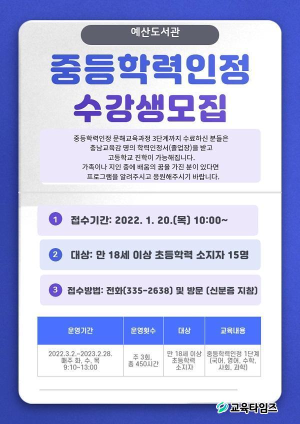 [±³À°Å¸ÀÓÁî = ÃÖ¿ë°ü ±âÀÚ] ¿¹»ê±³À°Áö¿øÃ»¿¹»êµµ¼°üÀº ÁßÇÐ Çз ¹Ì¼ÒÁöÀڵ鿡°Ô ÇзÂÃëµæÀÇ ±âȸ¸¦ Á¦°øÇϰíÀÚ 1¿ù 20ÀÏ(¸ñ)ºÎÅÍ 2022³â ÁßÇÐÇзÂÀÎÁ¤ ¹®Çر³½Ç 1´Ü°è ¼ö°»ý ¸ðÁýÀ» ½ÃÀÛÇÑ´Ù.