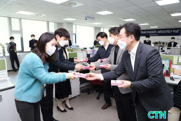 ¡ãÀÌÁ¾¿í Ãæ³²¼¼Á¾³óÇùº»ºÎÀå(¿À¸¥ÂÊ ¾Õ), À̱â¹ü Ãæ³²¼¼Á¾³ëÁ¶À§¿øÀå(¿À¸¥ÂÊ °¡¿îµ¥), ¿©¿îö ³óÇùÀºÇàÃæ³²º»ºÎÀå(¿À¸¥ÂÊ µÚ)ÀÌ ¼³¸íÀý ÀÌÈÄ Äڷγª19 È®»ê ¹æÁö¸¦ À§ÇÑ ÀÚ°¡°Ë»çŰƮ¸¦ Á÷¿øµé¿¡°Ô Àü´ÞÇϰí ÀÖ´Ù.(Ãæ³²¼¼Á¾³óÇù/Á¦°ø)