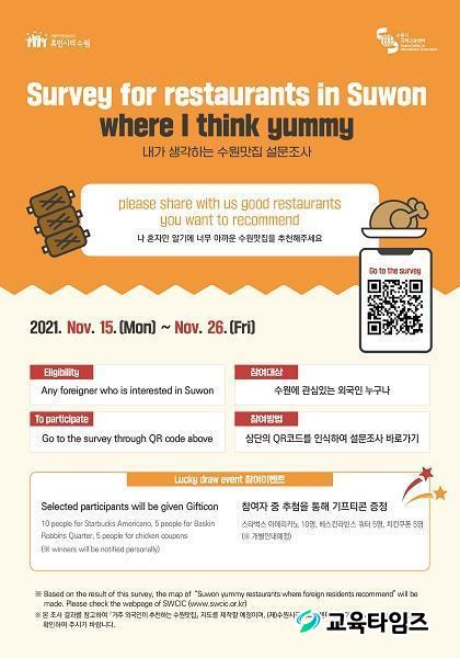[±³À°Å¸ÀÓÁî/°æ±â] ±èÁö¿ì ±âÀÚ = ¼ö¿ø½Ã±¹Á¦±³·ù¼¾ÅͰ¡ 11¿ù 26ÀϱîÁö ¿Ü±¹ÀεéÀ» ´ë»óÀ¸·Î '³»°¡ »ý°¢ÇÏ´Â ¼ö¿øÀÇ ¸ÀÁýÀº?' ¼³¹®Á¶»ç¸¦ ÁøÇàÇÑ´Ù.
