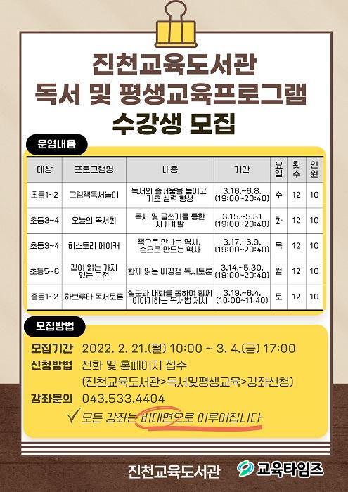 [±³À°Å¸ÀÓÁî/ÃæºÏ±³À°] À̺´Á¾ ±âÀÚ = ÁøÃµ±³À°µµ¼°ü(°üÀå ±è¹Î¼ö)Àº 21ÀϺÎÅÍ ÇÔ²² ¼ºÀåÇØ³ª°¡´Â üÇèÀû µ¶¼È°µ¿À» Áö¿øÇϱâ À§ÇÑ 2022³â ºñ´ë¸é µ¶¼±³À°ÇÁ·Î±×·¥ ¼ö°»ýÀ» ¸ðÁýÇÑ´Ù.