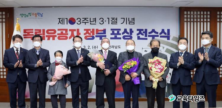 [±³À°Å¸ÀÓÁî/»çȸ] Çϼº¸Å ±âÀÚ = Àü¶ó³²µµ´Â 2ÀÏ µµÃ» VIP½Ç¿¡¼ Á¦103ÁÖ³â 3.1ÀýÀ» ¸Â¾Æ Á¤ºÎ Æ÷»ó Àü¼ö½ÄÀ» ¿¾î µ¶¸³¿îµ¿ÀÚ±Ý ¸ð±Ý, ¼ÒÀÛ±Ç ÀÌÀü ºÎ´çÇÔ¿¡ ´ëÇÑ ½ÃÀ§ µîÀ¸·Î Åõ¿ÁµÈ 4¸í¿¡°Ô Æ÷»óÀ» Àü´ÞÇß´Ù.
