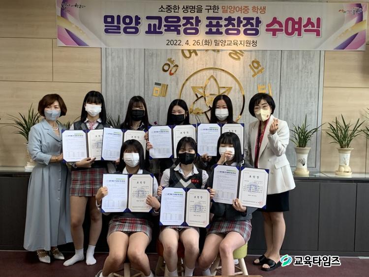 [±³À°Å¸ÀÓÁî/°æ³²±³À°] ¹æ¹ÌÈñ ±âÀÚ = °æ»ó³²µµ¹Ð¾ç±³À°Áö¿øÃ»(±³À°Àå ±èÁ¤Èñ)Àº Áö³ 27ÀÏ ¹Ð¾ç¿©ÀÚÁßÇб³ ±³Àå½ÇÀ» ¹æ¹®ÇÏ¿© ¼ÒÁßÇÑ »ý¸íÀ» ±¸ÇÑ ¹Ð¾ç¿©Áß Çлý 7¸í¿¡°Ô ±³À°Àå ǥâÀåÀ» ¼ö¿©ÇÏ°í °Ý·ÁÇß´Ù.
