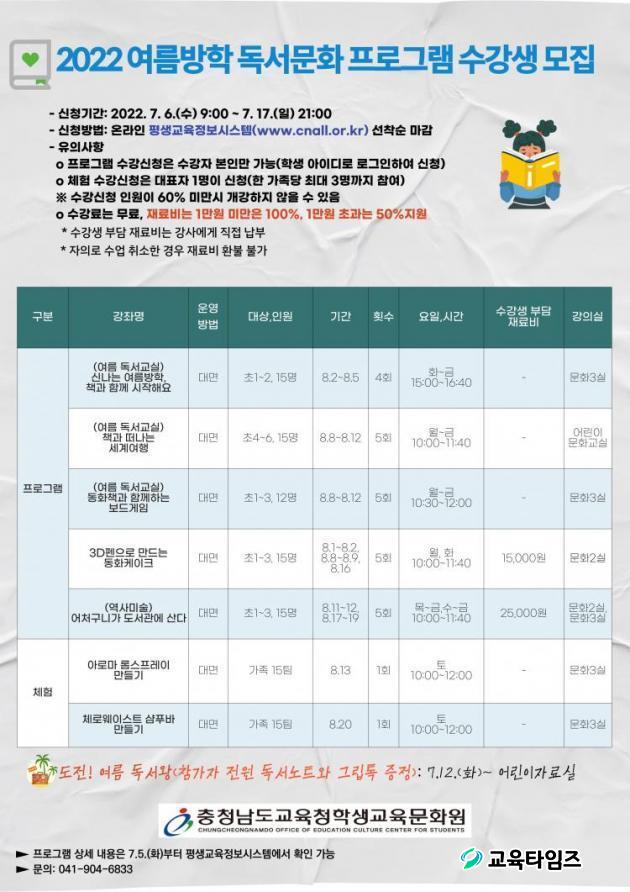 [±³À°Å¸ÀÓÁî/Ãæ³²±³À°] °Çö¼ö ±âÀÚ = ÃæÃ»³²µµ±³À°Ã»Çлý±³À°¹®È¿ø(¿øÀå ÀÌÇö¼·)Àº ¿©¸§¹æÇÐÀ» ¸ÂÀº Çлýµé¿¡°Ô ´Ù¾çÇÑ µ¶¼ ±³À°ÀÇ ±âȸ¸¦ Á¦°øÇϱâ À§ÇØ¡®2022³â ¿©¸§¹æÇÐ µ¶¼¹®È ÇÁ·Î±×·¥¡¯¼ö°»ýÀ» 7¿ù 6ÀϺÎÅÍ ¸ðÁýÇÑ´Ù.
