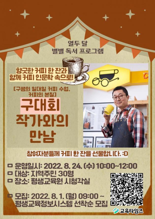 ¾Æ¿ï·¯ ¿À´Â 8¿ù 24ÀÏ ¼ö¿äÀÏ¿¡´Â Àü½Ã µµ¼ Áß ÇÑ ±ÇÀÎ ±¸½ÜÀÇ ÀÏ´ëÀÏ Ä¿ÇÇ ¼ö¾÷ÀÇ ÀúÀÚÀÌÀÚ ±¸´ëȸĿÇÇ ´ëÇ¥ ±¸´ëȸ ÀÛ°¡¿Í ÇÔ²²ÇÏ´Â Ä¿ÇÇ Àι®ÇÐ °¿¬ÀÌ ÁøÇàµÇ¸ç, 8¿ù 1ÀÏ 9½ÃºÎÅÍ Æò»ý±³À°Á¤º¸½Ã½ºÅÛÀ» ÅëÇØ ¼±Âø¼øÀ¸·Î ¸ðÁýÇÑ´Ù.