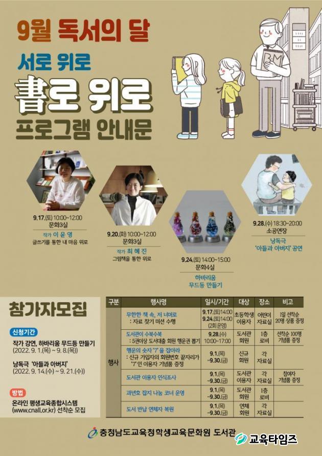 ´ëÇ¥ÀûÀÎ Çà»ç·Î´Â 9¿ù 17ÀÏ(Åä) ÀÌÀ±¿µ ÀÛ°¡ °¿¬(±Û¾²±â¸¦ ÅëÇÑ ³» ¸¶À½ À§·Î), 9¿ù 20ÀÏ(È) ÃÖÇýÁø ÀÛ°¡ÀÇ ¡°±×¸²Ã¥À» ÅëÇÑ À§·Î¡±°¿¬À», 9¿ù 24ÀÏ(Åä)¡°ÇϹٸ®¿ò ¹«µåµî ¸¸µé±â¡±, 9¿ù 28ÀÏ(¼ö) ¡°µµ¼°üÀÌ ¼öºÏ¼öºÏ-¼±¹°ÀÌ ½ñ¾ÆÁö´Â ÀÚ·á½Ç À̺¥Æ®¡±¿Í °¡Á·À» À§ÇÑ¡°¾Æµé°ú ¾Æ¹öÁö ³¶µ¶±Ø¡±À» ¿î¿µÇÑ´Ù.