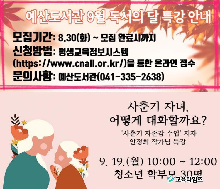 Ư°Àº 9¿ù 19ÀÏ ¿ÀÀü 10½Ã¿¡ ¿¹»êµµ¼°ü Æò»ýÇнÀ½Ç¿¡¼ ¡¸»çÃá±â ÀÚ³à, ¾î¶»°Ô ´ëÈÇÒ±î¿ä?¡¹¸¦ ÁÖÁ¦·Î ¡¸»çÃá±â ÀÚÁ¸°¨ ¼ö¾÷¡¹ÀÇ ÀúÀÚ ¾ÈÁ¤Èñ ÀÛ°¡¸¦ ÃÊÃ»ÇØ ÁøÇàµÈ´Ù.