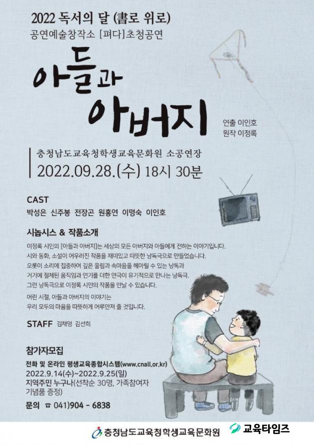 ³¶µ¶±Ø ¡®¾Æµé°ú ¾Æ¹öÁö¡¯´Â ¿À´Â 9¿ù 28ÀÏ 18:30¿¡ ÃæÃ»³²µµ±³À°Ã»Çлý±³À°¹®È¿ø ¼Ò°ø¿¬Àå¿¡¼ ¿î¿µµÇ¸ç, Áö¿ªÁֹΠ´©±¸³ª Âü°¡ÇÒ ¼ö ÀÖ´Ù. Âü°¡ ½ÅûÀº ÀüÈ(041-904-6836) ¹× Æò»ý±³À°Á¤º¸½Ã½ºÅÛ(www.cnall.or.kr)¿¡¼ ÇÒ ¼ö ÀÖ´Ù. Âü°¡ ½Åû ¼±Âø¼ø 30¸í°ú °¡Á· Âü¿©ÀÚ¿¡°Ô´Â ¼ÒÁ¤ÀÇ ±â³äǰÀ» ÁõÁ¤ÇÒ ¿¹Á¤ÀÌ´Ù.