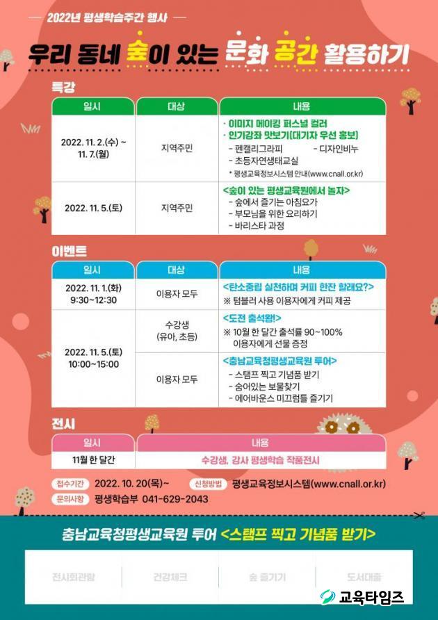 [±³À°Å¸ÀÓÁî/Ãæ³²±³À°] °Çö¼ö ±âÀÚ = Ãæ³²±³À°Ã»Æò»ý±³À°¿ø(¿øÀå ±æÀçȯ)Àº 2022³âµµ Æò»ýÇнÀÁÖ°£(11. 1.~11. 7.)À» ¸ÂÀÌÇÏ¿© Áö¿ªÁÖ¹ÎÀ» ´ë»óÀ¸·Î ¡®¿ì¸® µ¿³× ½£ÀÌ ÀÖ´Â ¹®È °ø°£ Ȱ¿ëÇϱ⡯¸¦ ÁÖÁ¦·Î Çà»ç¸¦ ¿î¿µÇÑ´Ù.