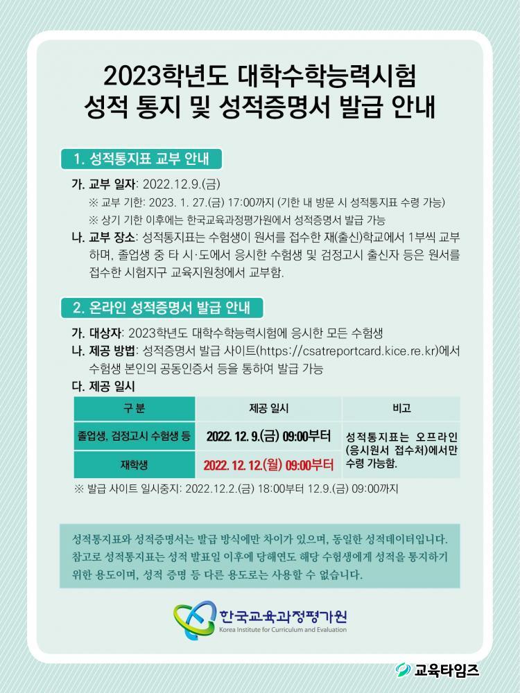 °ø½ÄÀûÀÎ ¼ºÀûÁõ¸í ¿ëµµ·Î »ç¿ë°¡´ÉÇÑ ¼ºÀûÁõ¸í¼´Â ¿Â¶óÀÎ ¹ß±Þ»çÀÌÆ®¿¡¼ ¼öÇè»ý º»ÀÎÀÇ °øÀÎÀÎÁõ¼¸¦ ÅëÇØ ¹ß±Þ¹ÞÀ» ¼ö ÀÖÀ¸¸ç, Á¹¾÷»ý°ú °ËÁ¤°í½Ã ¼öÇè»ý µîÀº 12¿ù 9ÀÏ(±Ý) 09:00ºÎÅÍ, ÀçÇлýÀº 12¿ù 12ÀÏ(¿ù) 09:00ºÎÅÍ ¿Â¶óÀÎ ¹ß±ÞÀÌ °¡´ÉÇϸç, Çѱ¹±³À°°úÁ¤Æò°¡¿ø¿¡ ¹æ¹® ¹× ÆÑ½º, ¿ìÆí ¹ß±Þµµ °¡´ÉÇÏ´Ù.