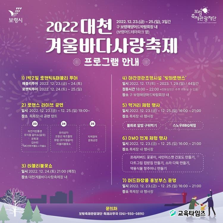À̹ø ÃàÁ¦´Â 2022º¸·ÉÇØ¾ç¸Óµå¹Ú¶÷ȸÀå(º¸·É¸ÓµåÅ׸¶ÆÄÅ© ¾Õ) ÀÏ¿ø¿¡¼ ÆîÃÄÁö¸ç, ½Ã´Â ¿¬¸» ·Î¸ÇƽÇÑ ºÐÀ§±â Á¶¼ºÀ» À§ÇØ ¹Ú¶÷ȸÀå ³» Ä¡À¯ÀÇ ½£¿¡ ¼Ò³ª¹«¸¦ Ȱ¿ëÇÑ LED °æ°üÁ¶¸í, ÀüÅëÇÑÁö¸¦ Ȱ¿ëÇÑ ¾Ö´Ï¸ÞÀÌ¼Ç Ä³¸¯ÅÍ, ½º¸¶Æ® LED ºû ÅͳΠµî ´ëÃµÇØ¼ö¿åÀå ÀÏ¿ø¿¡ ¾ß°£ °æ°ü½Ã¼³À» ¼³Ä¡Çß´Ù.