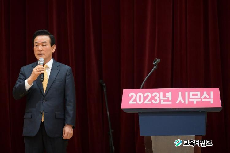 [±³À°Å¸ÀÓÁî/Ãæ³²] ±è¿µ¼ö ±âÀÚ = ³í»ê½Ã°¡ 2ÀÏ ¿ÀÀü ±¹¹ÎüÀ°¼¾ÅÍ¿¡¼ ¡®2023³â °è¹¦³â ½Ã¹«½Ä Çà»ç¡¯¸¦ °®°í Èñ¸ÁÂù »õÇØ ´ÙÁüÀ» ÇÔ²² ³ª´³´Ù.