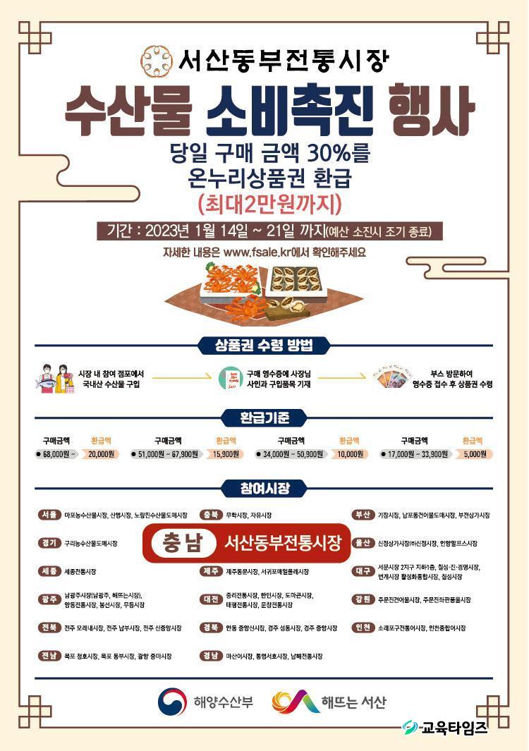12ÀÏ ½Ã¿¡ µû¸£¸é À̹ø Çà»ç´Â ¼»êµ¿ºÎÀüÅë½ÃÀå¿¡¼ ±¹³»»ê ¼ö»ê¹°À» ±¸ÀÔÇÑ ±¸¸ÅÀÚ¿¡°Ô ´çÀÏ ±¸¸Å±Ý¾×ÀÇ 30%(ÃÖ´ë 2¸¸ ¿ø)¸¦ ¿Â´©¸® »óǰ±ÇÀ¸·Î ȯ±ÞÇØ ÁØ´Ù.