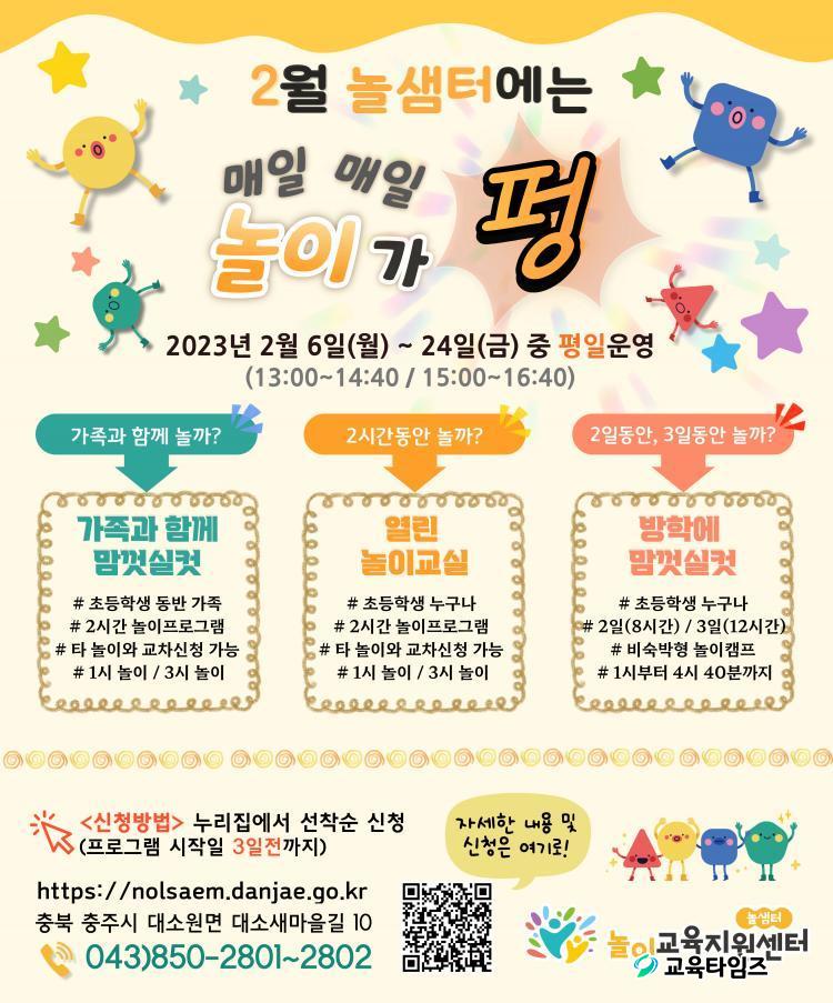 ³îÀ̱³À°Áö¿ø¼¾ÅÍ °ü°èÀÚ´Â "2¿ù °Ü¿ï¹æÇÐ ³îÀÌ ÇÁ·Î±×·¥À» ½ÃÀÛÀ¸·Î 2023³â ³î»ùÅÍ ÇÁ·Î±×·¥À» ¿î¿µÇÒ ¿¹Á¤À̸ç, Çб³ ´ë»ó, ¸¶À» ´ë»ó, ÃʵîÇлý °³ÀÎ ´ë»óÀÇ ´Ù¾çÇÑ ³îÀÌ ÇÁ·Î±×·¥À» ¿î¿µÇÏ¿© ±³À°°øµ¿Ã¼¿Í °ø°¨‧µ¿ÇàÇÏ´Â ³îÀ̹®È¸¦ È®»ê½Ãų ¿¹Á¤ÀÌ´Ù"°í ¸»Çß´Ù.