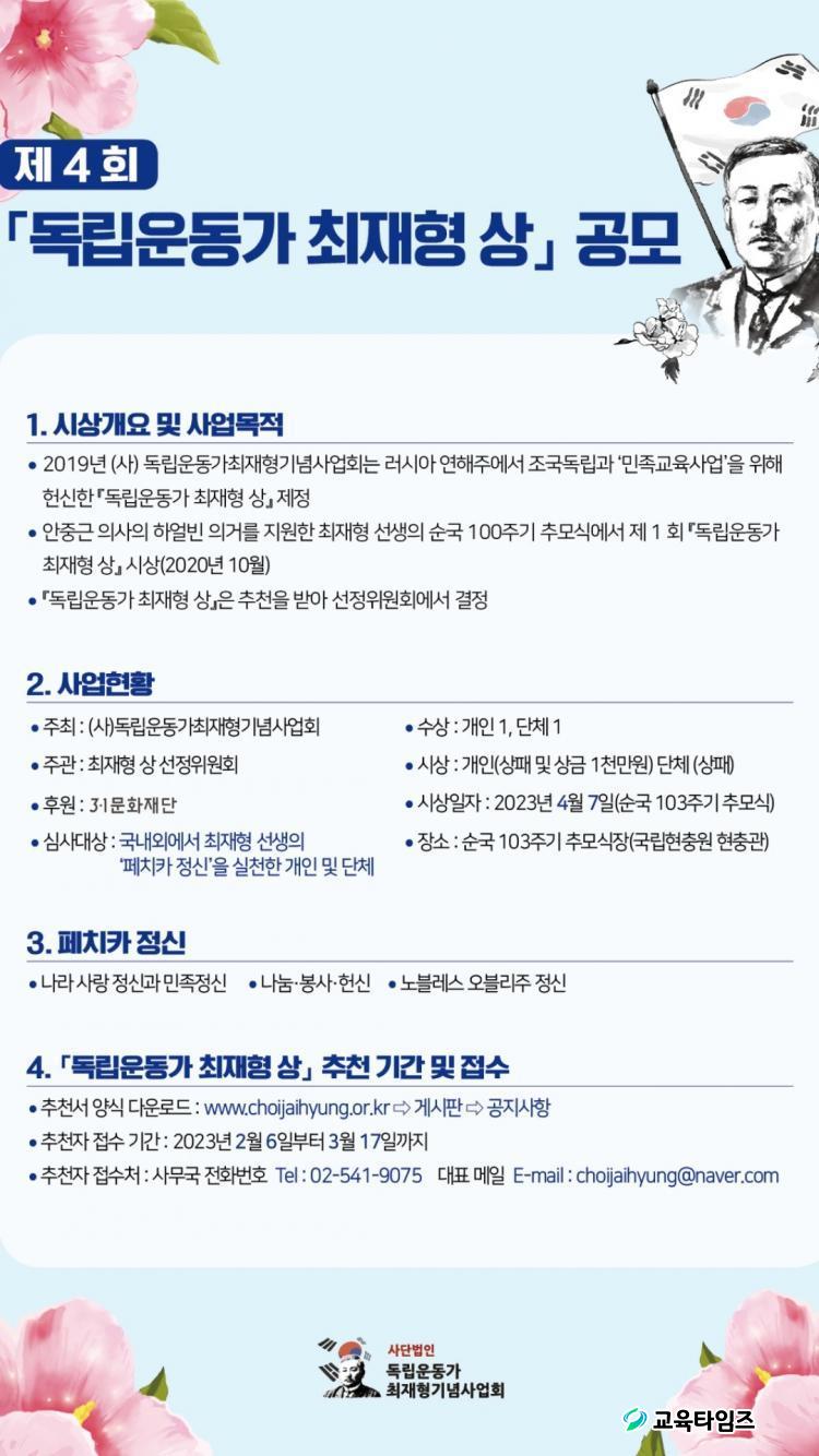 [±³À°Å¸ÀÓÁî/»çȸ] ÀåÀºÈñ ±âÀÚ = µ¶¸³¿îµ¿°¡ÃÖÀçÇü±â³ä»ç¾÷ȸ(ÀÌ»çÀå ¹®¿µ¼÷)´Â 'Á¦4ȸ µ¶¸³¿îµ¿°¡ ÃÖÀçÇü»ó'À» °ø¸ðÇÑ´Ù°í ¹àÇû´Ù.