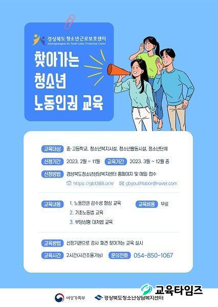 ã¾Æ°¡´Â ³ëµ¿ÀαDZ³À°Àº û¼Ò³â À¯°ü±â°ü ¹× Áß.°íµîÇб³ ÀçÇлý µî û¼Ò³âÀ» ´ë»óÀ¸·Î ³ëµ¿Àαǰ¨¼ö¼º, ±âÃʳ뵿¹ý, ºÎ´çó¿ì ´ë󹿹ý µîÀ» ±³À°ÇÏ¸ç °æ»óºÏµµÃ»¼Ò³â»ó´ãº¹Áö¼¾ÅÍ È¨ÆäÀÌÁö(www.gb1388.or.kr)¸¦ ÅëÇØ »ó½Ã ½ÅûÇÒ ¼ö ÀÖ´Ù.