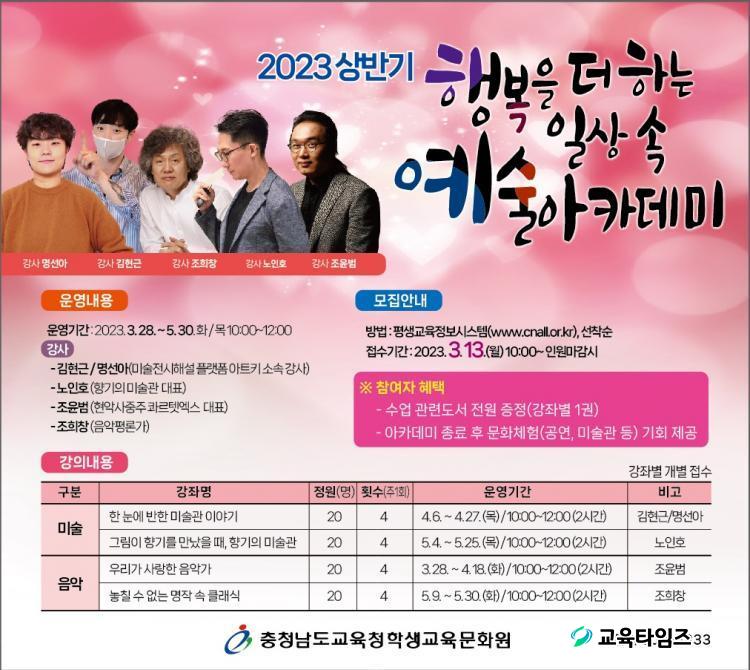 [±³À°Å¸ÀÓÁî/Ãæ³²±³À°] °Çö¼ö ±âÀÚ = ÃæÃ»³²µµ±³À°Ã»Çлý±³À°¹®È¿ø(¿øÀå ÀÌÇö¼·)Àº ¿À´Â 3¿ù 13ÀÏ(¿ù)ºÎÅÍ 2023³â »ó¹Ý±â ÀÏ»ó ¼Ó ÇູÀ» ´õÇϴ¡®¿¹¼ú ¾ÆÄ«µ¥¹Ì¡¯¼ö°»ýÀ» ¸ðÁýÇÑ´Ù.