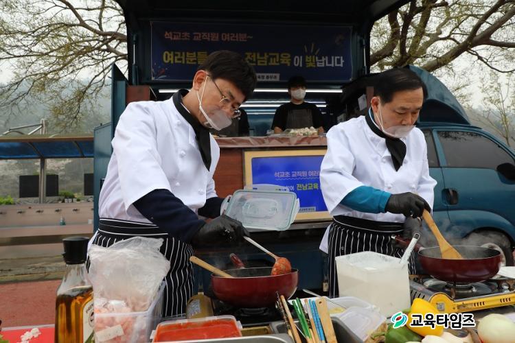 ³ë±Ç¿ °úÀå(¿À¸¥ÂÊ)ÀÌ Áøµµ ¼®±³ÃÊ ±³Á÷¿øÀ» À§ÇÑ À½½ÄÀ» ¿ä¸®Çϰí ÀÖ´Ù. [»çÁøÁ¦°ø=Àü³²±³À°Ã»]