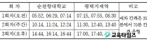 ½Ã´Â Áö³ÇØ 8¿ùºÎÅÍ Ãæ³²µµ¿Í ÇÔ²² ¿¬°èÇÏ¿© ÃßÁøÇÑ »ç¾÷À¸·Î ¼øÃµÇâ´ë¸¦ ±âÁ¡À¸·Î ¾Æ»êÅ͹̳Î~¹è¹æ¿ª~õ¾È½Ãû~Çѱâ´ë~°øÁÖ´ë~´ëÈ︮~¾È±Ã¸®~ÆòÅÃÁöÁ¦¿ª(SRTÀÌ¿ë)~ÆòÅÃÅ͹̳αîÁö ¿Õº¹ ¿îÇàÇÏ´Â ±¤¿ª ¹ö½º ³ë¼±À¸·Î, ÀÌ¿ë¿ä±ÝÀº ÀÏ¹Ý 2,000¿ø, ¾î¸°ÀÌ1,000¿ø, û¼Ò³â 1,600¿øÀ̸ç, 3´ë ¹ö½º·Î 1ÀÏ ÃÑ ¿îÇà Ƚ¼ö´Â 18ȸ´Ù.