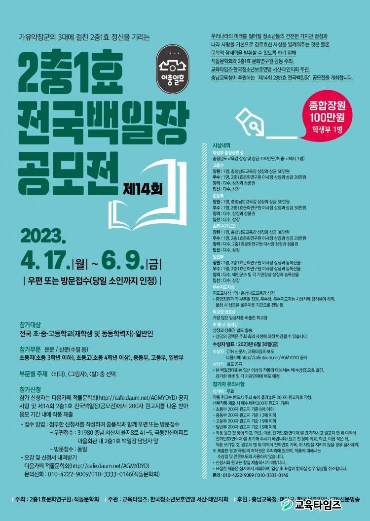 Á¦14ȸ 2Ãæ1È¿ Àü±¹¹éÀÏÀå °ø¸ðÀüÀÇ ÀÛǰ Á¢¼ö´Â ´ÙÀ½ ´Þ(6¿ù) 9ÀϱîÁöÀ̸ç, Âü°¡ºÎ¹®Àº ÃÊ¡¤Áß¡¤°í¡¤ÀϹݺηΠ'¹Ù´Ù', '±×¸²ÀÚ', '¹ß' Áß¿¡¼ ¼±Åà ¿î¹® ¶Ç´Â »ê¹®À» ÀÛ¼º, ¿ìÆí¡¤¹æ¹® Á¢¼öÇÏ¸é µÈ´Ù.