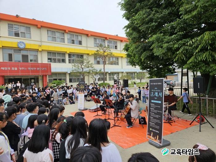 2023. ¿¹¼úµå¸²°ÅÁ¡Çб³·Î ¼±Á¤µÈ ÁøÃµ»ï¼öÃÊ´Â Çлýµé¿¡°Ô ´õ¿í ´Ù¾çÇÏ°í ¼öÁØ ³ôÀº À½¾Ç üÇè Ȱµ¿À» Á¦°øÇÏ°í ±³À°°øµ¿Ã¼°¡ ¾î¿ì·¯Áö´Â °ø¿¬ÀÇ ÇѸ¶´çÀ» ÆîÄ¡±â À§ÇØ ¿¬ÁÖȸ¸¦ °³ÃÖÇß´Ù. ÇÁ¶û½º ÀÛ°î°¡ ºñÁ¦ÀÇ ¿ÀÆä¶ó Ä«¸£¸àÀÇ ¼°îÀ¸·Î, °æÄèÇÑ ¿ÀÇÁ´×À¸·Î À¯¸íÇÑ 'Ä«¸£¸à ¼°î'À» ºñ·ÔÇØ '»ç¶ûÀÇ Àλç', 'º£Å亥 ¹ÙÀÌ·¯½º' µî ÃÑ 5°îÀ» ¿¬ÁÖÇß´Ù. µî±³ÇÏ´ø Çлýµé°ú Çкθð, ±æÀ» °¡´ø ÇàÀεéÀº ¾Æ¸§´Ù¿î À½¾Ç ¼Ò¸®¿¡ Àá½Ã ¹ß°ÉÀ½À» ¸ØÃß°í ¹àÀº ¹Ì¼Ò·Î À½¾ÇÀ» °¨»óÇÑ ÈÄ Å« ¹Ú¼ö°¥Ã¤¸¦ º¸³Â´Ù. ÁøÃµ»ï¼öÃʵîÇб³´Â ²Þ°ú ³¢¸¦ ºû³»´Â ´Ù¾çÇÑ ¹®È¿¹¼ú±³À°È°µ¿À» ÆîÄ¡°í Àִµ¥ ƯÈ÷ ¼Ò¿Ü Áö¿ªÀÇ ¿¹¼ú ¹®È¸¦ °æÇèÇϰí Çлý ÁÖµµÀÇ ¹®È¿¹¼ú±³À° Ȱ¼ºÈ·Î ½É¸®・Á¤¼ ¾ÈÁ¤ ¹× Á¶È·Î¿î Àμº ÇÔ¾çÀ» À§ÇØ ³ë·ÂÇϰí ÀÖ´Ù. ±èÇö¼ø ±³ÀåÀº "¾Æ¸§´Ù¿î ¼±À²°ú ÇлýµéÀÇ ¹àÀº ¿ôÀ½ÀÌ ¾î¿ì·¯Á® ÇູÇÑ µî±·±æÀÌ µÇ¾ú´Ù. ÀÌ·± ´Ù¾çÇÑ ¹®È¿¹¼ú °æÇèÀ» ÅëÇØ ¿ì¸® ÇлýµéÀÌ ¹Ù¸£°í µû¶æÇÑ ÀμºÀ» °¡Áö´Â µ¥ µµ¿òÀÌ µÇ¾úÀ¸¸é ÁÁ°Ú´Ù"°í ÀüÇß´Ù.