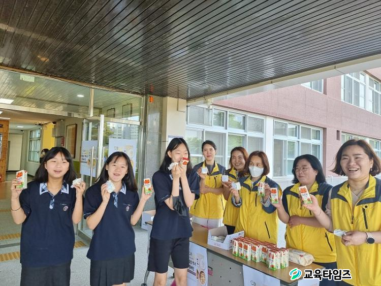 ¾ÆÄ§ µî±³ ½Ã°£, Çкθðȸ ÀÓ¿øµéÀº µî±³ÇÏ´Â Çлýµé¿¡°Ô ¾ÆÄ§¹ä ´ë¿ëÀ¸·Î ¶±°ú À½·á¸¦ ³ª´²ÁÖ¸ç, Áñ°Ì°í ÇູÇÑ ÇÏ·çÀÇ ½ÃÀÛÀÌ µÉ ¼ö ÀÖµµ·Ï °Ý·Á Àλ縦 ÀüÇß´Ù.