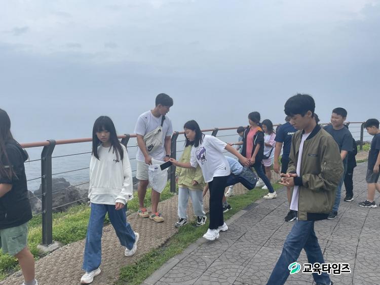 µ¿ÀÌÃÊ ÇлýµéÀÌ ¼öÇп©Çà Áß Á¦ÁÖ ¹Ù´Ù¸¦ ±¸°æÇÏ¸é¼ »êÃ¥·ÎÀÇ ¾²·¹±â¸¦ Áݰí ÀÖ´Ù. [»çÁøÁ¦°ø=¿Áõ±³À°Áö¿øÃ»]