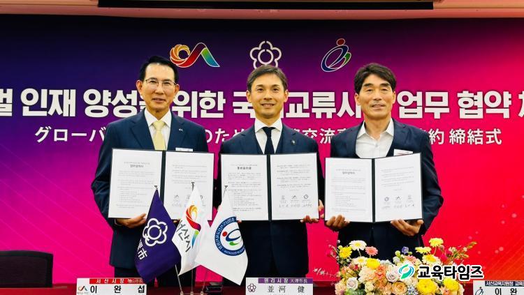 ÀÌ¿ÏÅà ±³À°ÀåÀº ¡°¼»ê±³À°Áö¿øÃ»-¼»ê½Ãû-µ§¸®½ÃÀÇ ±Û·Î¹ú ÀÎÀç ¾ç¼ºÀ» À§ÇÑ ±¹Á¦±³·ù ¾÷¹«Çù¾àÀº ¿ì¸® ÇлýµéÀÌ ¿ª»ç¿¡ ´ëÇÑ ÀÚ±à½ÉÀ» °®°í ³ª¾Æ°¡ »îÀÇ ÁÖü·Î ¼ºÀåÇÏ´Â ¼¼°è½Ã¹Î ¿ª·®À» ÇÔ¾çÇÏ´Â Ãʼ®ÀÌ µÉ °Í¡±À̶ó¸ç, "ÇлýµéÀÇ ±¹Á¦±³·ù ±âȸ¸¦ ´õ¿í ´Ù¾çÇÏ°Ô Á¦°øÇϰڴÙ"°í ÀüÇß´Ù.