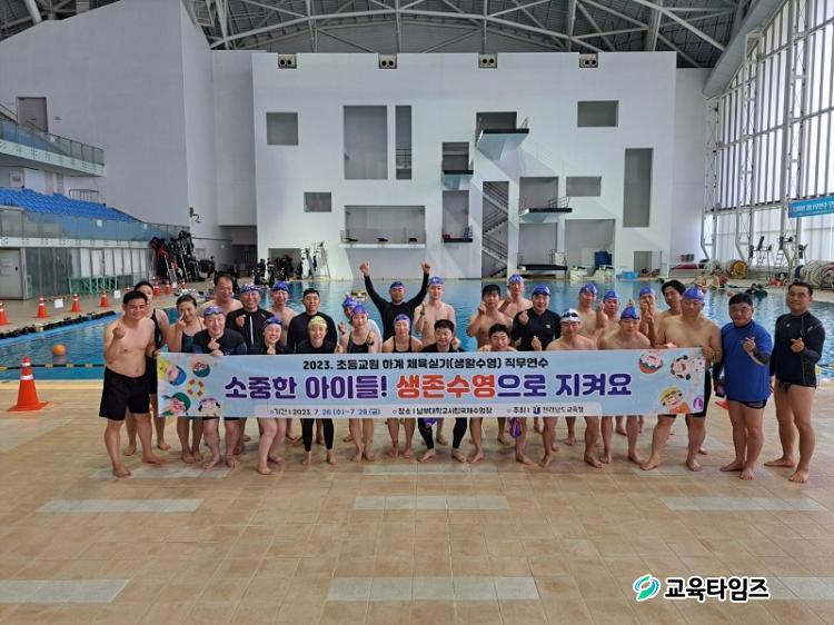 '2023 Ãʵ¿ø ÇÏ°è »ýÁ¸¼ö¿µ Á÷¹«¿¬¼ö'¿¡ Âü¿©ÇÑ ±³¿øµéÀÌ ±â³ä»çÁø ÃÔ¿µÀ» Çϰí ÀÖ´Ù. [»çÁøÁ¦°ø=Àü³²±³À°Ã»]