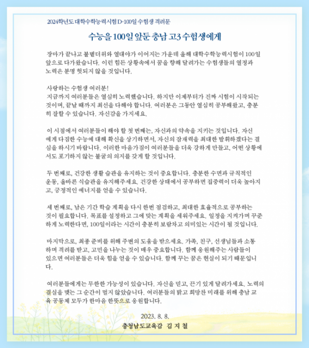 [±³À°Å¸ÀÓÁî/Ãæ³²±³À°] ÀåÀºÈñ ±âÀÚ = Ãæ³²±³À°Ã»(±³À°°¨ ±èÁöö)Àº 2024Çг⵵ ´ëÇмöÇдɷ½ÃÇèÀ» 100ÀÏ ¾ÕµÐ 8ÀÏ(È) µµ³» °í3 ¼öÇè»ý¿¡°Ô º¸³»´Â °Ý·Á¹®À» ¹ß¼ÛÇß´Ù.