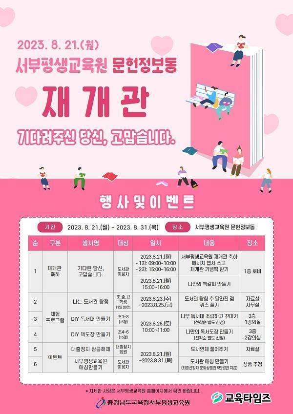 Àç°³°üÀ» ±â³äÇÏ¿© 21ÀϺÎÅÍ 31ÀϱîÁö ´Ù¾çÇÑ Çà»çµµ ÁغñÇß´Ù. °³°üÀÏÀÎ 21ÀÏ¿¡´Â ½Ã¹Îµé°ú Àç°³°ü ±â»ÝÀ» ³ª´©°íÀÚ ÃàÇÏ ¿±¼¾²±â¿Í ¶±³ª´®, ³ª¸¸ÀÇ Ã¥°¥ÇÇ ¸¸µé±â¸¦ ¿î¿µÇÑ´Ù. À̾î 23ÀϺÎÅÍ 25ÀϱîÁö ¡®³ª´Â µµ¼°ü ŽÁ¤-µµ¼°ü ´Þ¶óÁø Á¡ ÄûÁî Ç®±â¡¯, 26ÀÏ, ¡®DIYµ¶¼´ë, Ã¥µµÀå ¸¸µé±â¡¯ üÇè ÇÁ·Î±×·¥ÀÌ ÁøÇàµÈ´Ù. ¶ÇÇÑ À̺¥Æ® Çà»ç·Î 21ºÎÅÍ 31ÀϱîÁö µµ¼´ëÃâÁ¤Áö ȸ¿øÀÇ ¿¬Ã¼¸¦ Ç®¾îÁÙ ¿¹Á¤À̸ç, ¼ºÎÆò»ý±³À°¿ø ¾ÖΏ¸µé±â °ø¸ðµµ ÇÔ²² ÁøÇàµÈ´Ù.