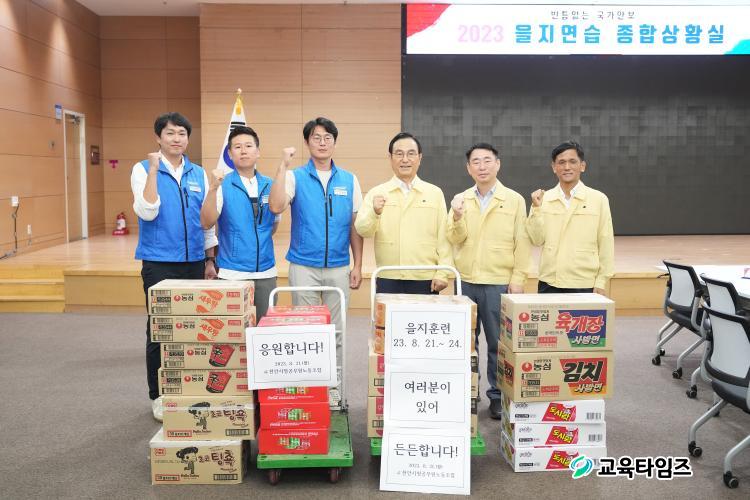 ³ëÁ¶´Â º»¿¬ÀÇ ¾÷¹« ¿Ü ÀüÀï¤ýÅ×·¯ µî ±¹°¡ºñ»ó»çÅ ¹ß»ýÀ» ´ëºñÇÑ ºñ»ó ´ëºñÈÆ·ÃÀ» À§ÇØ 24½Ã°£ ±Ù¹«ÇÏ´Â Á¶ÇÕ¿øÀ» °Ý·ÁÇϰí, ÁغñÇÑ ¶ó¸é, À½·á, ¾ÆÀ̽ºÅ©¸² µî À§¹®Ç°À» Àü´ÞÇÏ¿´´Ù.