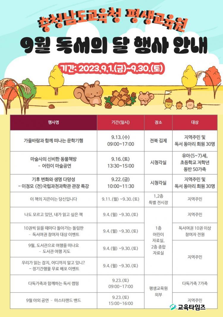 [±³À°Å¸ÀÓÁî/Ãæ³²±³À°] ±è¹ÌÁ¤ ±âÀÚ = ÃæÃ»³²µµ±³À°Ã»Æò»ý±³À°¿ø(¿øÀå ÀÌ¿µÁø)Àº 9¿ù ÇÑ ´Þ µ¿¾È ÀÚ·á½Ç ÀÌ¿ëÀÚ ¹× Áö¿ªÁÖ¹ÎÀÇ µµ¼°ü ÀÌ¿ë Ȱ¼ºÈ¿Í µ¶¼ Èï¹Ì À¯¹ßÀ» À§ÇØ ¡®2023³â 9¿ù µ¶¼ÀÇ ´Þ¡¯Çà»ç¸¦ ÁøÇàÇÑ´Ù.