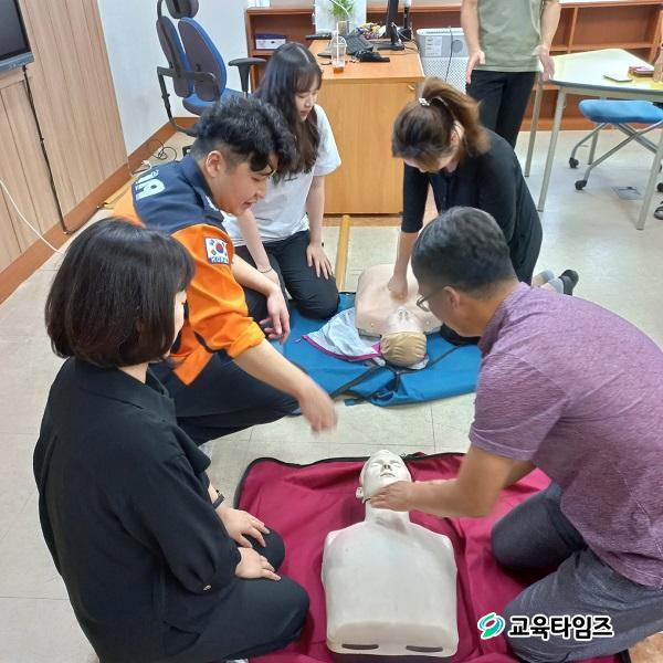 ½ÉÆó¼Ò»ý¼ú ½Ç½ÀÀ» Çϱâ À§ÇØ 2¸í¾¿ ¦À» Áö¾î ¿¬½ÀÀ» Çߴµ¥ ´Ùµé ÁøÁöÇÑ ÀÚ¼¼·Î Á¤È®ÇÏ°Ô Âü¿©Çß´Ù. º»±³´Â ½ÉÆó¼Ò»ý¼ú°ú ÇÏÀÓ¸®È÷¹ýÀ» ÅëÇØ ÇлýµéÀÌ ¾ÈÀüÇÏ°Ô »ýȰÇÒ ¼ö ÀÖµµ·Ï ³ë·ÂÇϰí ÀÖ´Ù.