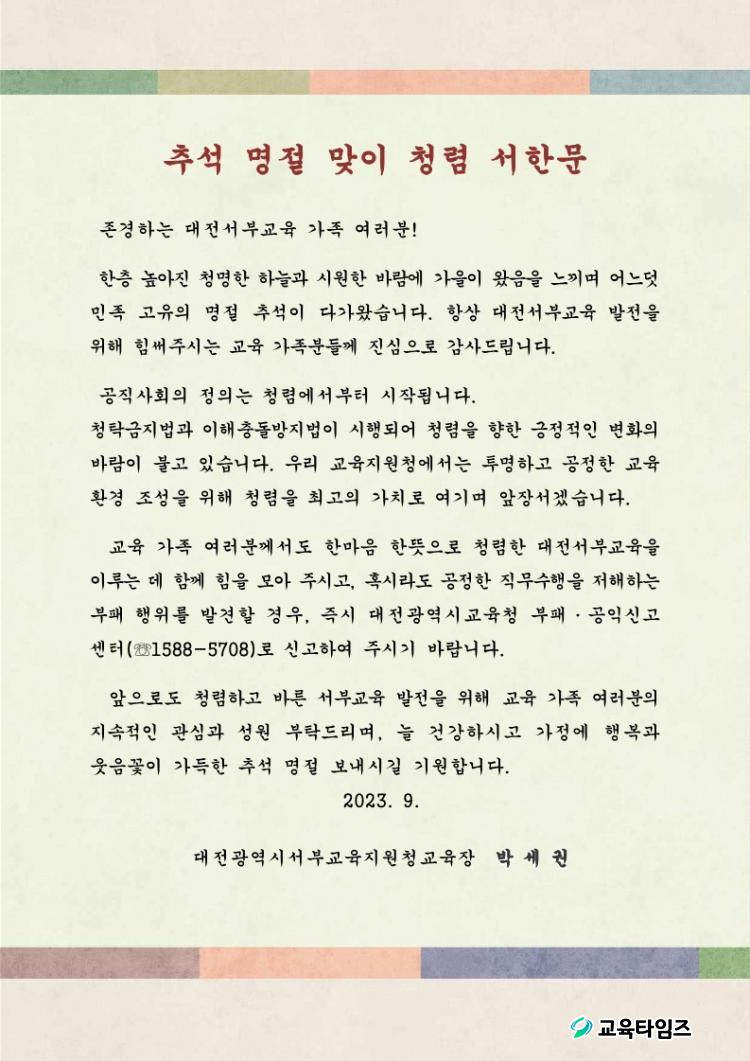 [±³À°Å¸ÀÓÁî/´ëÀü±³À°] Á¤¹ÎÁØ ±âÀÚ = ´ëÀüµ¿‧¼ºÎ±³À°Áö¿øÃ»(±³À°Àå ÃÖÀç¸ð, ¹Ú¼¼±Ç)Àº Ãß¼® ¸íÀýÀ» ¸ÂÀÌÇÏ¿© û·Å½ÇõÀÇÁö¸¦ ´ãÀº ±³À°Àå ¼Çѹ®À» °ü³» À¯¡¤ÃÊ¡¤ÁßÇб³ ¹× ±³À°Áö¿øÃ» ±³Á÷¿øµé¿¡°Ô ¹ß¼ÛÇß´Ù.
