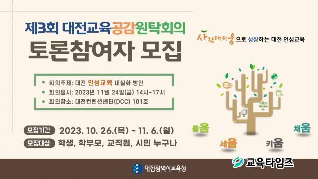 [±³À°Å¸ÀÓÁî/´ëÀü±³À°] Á¤¹ÎÁØ ±âÀÚ = ´ëÀü±¤¿ª½Ã±³À°Ã»(±³À°°¨ ¼³µ¿È£)Àº 11¿ù 24ÀÏ ¿ÀÈÄ 2½Ã, ´ëÀüÄÁº¥¼Ç¼¾ÅÍ(DCC)¿¡¼¡®´ëÀü Àμº±³À° ³»½ÇÈ ¹æ¾È¡¯À̶ó´Â ÁÖÁ¦·Î °³ÃֵǴ ¡¸2023³â Á¦3ȸ ´ëÀü±³À°°ø°¨¿øÅ¹È¸ÀÇ¡¹¿¡ Âü¿©ÇÒ Åä·ÐÂü¿©ÀÚ¸¦ ¸ðÁýÇÑ´Ù°í 26ÀÏ ¹àÇû´Ù.