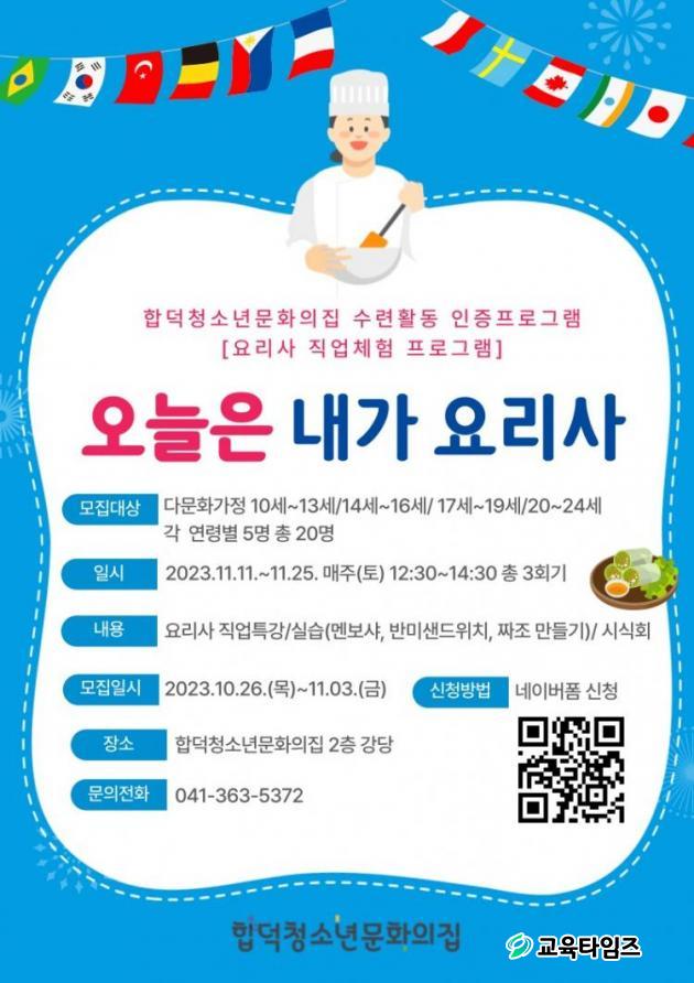 ÇÕ´öû¼Ò³â¹®ÈÀÇÁý¿¡¼´Â ¿ä¸®»ç Á÷¾÷üÇèÇÁ·Î±×·¥À» ÅëÇØ û¼Ò³â ½º½º·Î ÀÚ½ÅÀÇ Àû¼º°ú Èï¹Ì¸¦ ãÀ» ¼ö ÀÖ´Â ±âȸ¸¦ Á¦°øÇÏ¿© ÀÚ±âÁÖµµÀûÀÎ Áø·Î¼³°è¸¦ ÇÒ ¼ö ÀÖµµ·Ï ´Ùȸ±â ÇÁ·Î±×·¥À¸·Î ÁøÇàµÉ ¿¹Á¤ÀÌ´Ù.