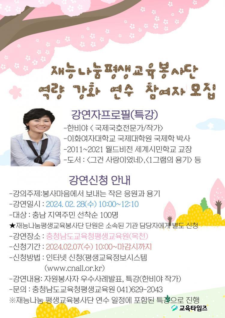 [±³À°Å¸ÀÓÁî/Ãæ³²±³À°] ±è¹ÌÁ¤ ±âÀÚ = ÃæÃ»³²µµ±³À°Ã»Æò»ý±³À°¿ø(¿øÀå ¼µ¿Ã¶)Àº 2.28(¼ö) 10:00~12:10¿¡ 2024³â Àç´É³ª´® Æò»ý±³À°ºÀ»ç´Ü ¿ª·®°È ¿¬¼öÀÇ ÀÏȯÀ¸·Î ÇѺñ¾ß ÀÛ°¡ Ư°À» ¿î¿µÇÑ´Ù.