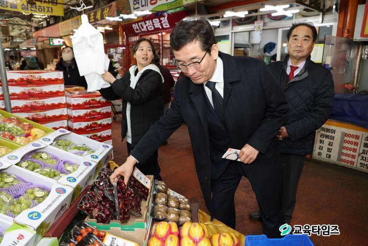 À±°Ç¿µ ÃæÃ»ºÏµµ±³À°°¨ÀÌ 5ÀÏ ¼³ ¸íÀýÀ» ¸Â¾Æ ûÁֽà º¹´ë°¡°æ½ÃÀåÀ» ¹æ¹®ÇØ À庸±â¸¦ Çϰí ÀÖ´Ù. [»çÁøÁ¦°ø=ÃæºÏ±³À°Ã»]