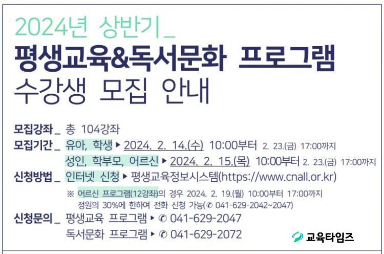 [±³À°Å¸ÀÓÁî/Ãæ³²±³À°] ±è¹ÌÁ¤ ±âÀÚ = ÃæÃ»³²µµ±³À°Ã»Æò»ý±³À°¿ø(¿øÀå ¼µ¿Ã¶)¿¡¼´Â ¿À´Â 2¿ù 14ÀÏ(¼ö)ºÎÅÍ, 2024³â »ó¹Ý±â Á¤±Ô Æò»ý±³À° ÇÁ·Î±×·¥ ÇнÀÀÚ¸¦ ¸ðÁýÇÑ´Ù. ¸ðÁý ±Ô¸ð´Â ÇÁ·Î±×·¥ ÃÑ 91°ÁÂ, Á¤¿øÀº 980¿© ¸íÀÌ´Ù.