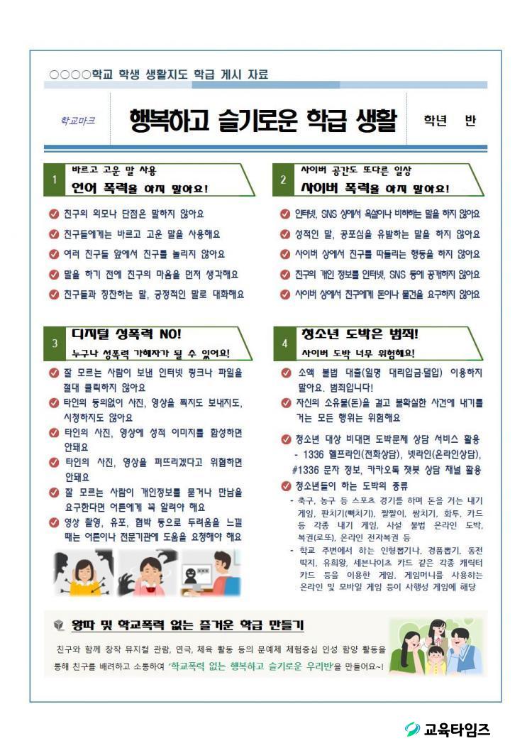 Çлý »ýȰÁöµµ ÇÐ±Þ °Ô½Ã¿ë ±³À° ÀÚ·áÀΡ¸ÇູÇÏ°í ½½±â·Î¿î ÇÐ±Þ »ýȰ¡¹¿¡´Â Çб³Æø·Â ¿¹¹æÀ» À§ÇÑ ¾ð¾îÆø·Â ÇÏÁö ¾Ê±â, ¹Ù¸£°í °í¿î ¸» »ç¿ëÇϱâ, »çÀ̹ö Æø·Â ÇÏÁö ¾Ê±â, µðÁöÅÐ ¼ºÆø·Â ÇÏÁö ¾Ê±â, »çÀ̹ö µµ¹ÚÇÏÁö ¾Ê±â¸¦ ÇÑ ´«¿¡ º¼ ¼ö ÀÖ°Ô ¾È³»Çϰí ÀÖ´Ù.