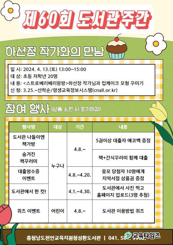 [±³À°Å¸ÀÓÁî/Ãæ³²±³À°] ±è¹ÌÁ¤ ±âÀÚ = ÃæÃ»³²µµÃµ¾È±³À°Áö¿øÃ»¼ºÈ¯µµ¼°ü(°üÀå ¹®Á¤¼÷)Àº 4¿ù 1ÀÏ(¿ù)ºÎÅÍ 4¿ù 30ÀÏ(È)±îÁö Á¦60ȸ µµ¼°üÁÖ°£ Çà»ç¸¦ ¿î¿µÇÑ´Ù°í ¹àÇû´Ù.