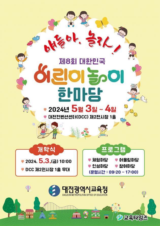 [±³À°Å¸ÀÓÁî/´ëÀü±³À°] Á¤¹ÎÁØ ±âÀÚ = ´ëÀü±¤¿ª½Ã±³À°Ã»(±³À°°¨ ¼³µ¿È£)Àº Á¦102ȸ ¾î¸°À̳¯À» ¸ÂÀÌÇÏ¿© 5¿ù 3ÀϺÎÅÍ 4ÀϱîÁö ´ëÀüÄÁº¥¼Ç¼¾ÅÍ(DCC) Á¦2Àü½ÃÀå¿¡¼ À¯Ä¡¿ø, ÃʵîÇб³, Ư¼öÇб³ Çлýµé°ú Çкθð, ½Ã¹Î µîÀÌ ÇÔ²² Âü¿©ÇÒ ¼ö ÀÖ´Â Áñ°Å¿î ³îÀÌ ÃàÁ¦ÀÎ ¡®Á¦8ȸ ´ëÇѹα¹ ¾î¸°ÀÌ ³îÀÌ ÇѸ¶´ç¡¯À» °³ÃÖÇÑ´Ù°í ¹àÇû´Ù.