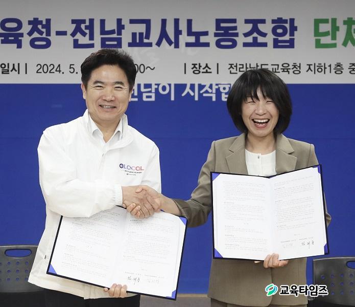 Àü³²±³»ç³ëµ¿Á¶ÇÕ ±è½Å¾È À§¿øÀåÀº "4³â ¸¸¿¡ Àü³²±³»ç³ëµ¿Á¶ÇÕ ´ÜüÇù¾àÀÌ Ã¼°áµÇ¾î ³Ê¹« °¨°Ý½º·´°í ±â»Ú´Ù"¸é¼ "¾ÕÀ¸·Î ´ÜüÇù¾àÀÌ Çб³¿¡¼ Àß ÁöÄÑÁö±æ ¹Ù¶ó°í, Àü¶ó³²µµ±³À°Ã»°ú ÇÔ²² Àü³²±³À°ÀÇ ¹ßÀüÀ» À§ÇØ ´õ¿í Èû¾²°Ú´Ù"°í ¼Ò°¨À» ¹àÇû´Ù.