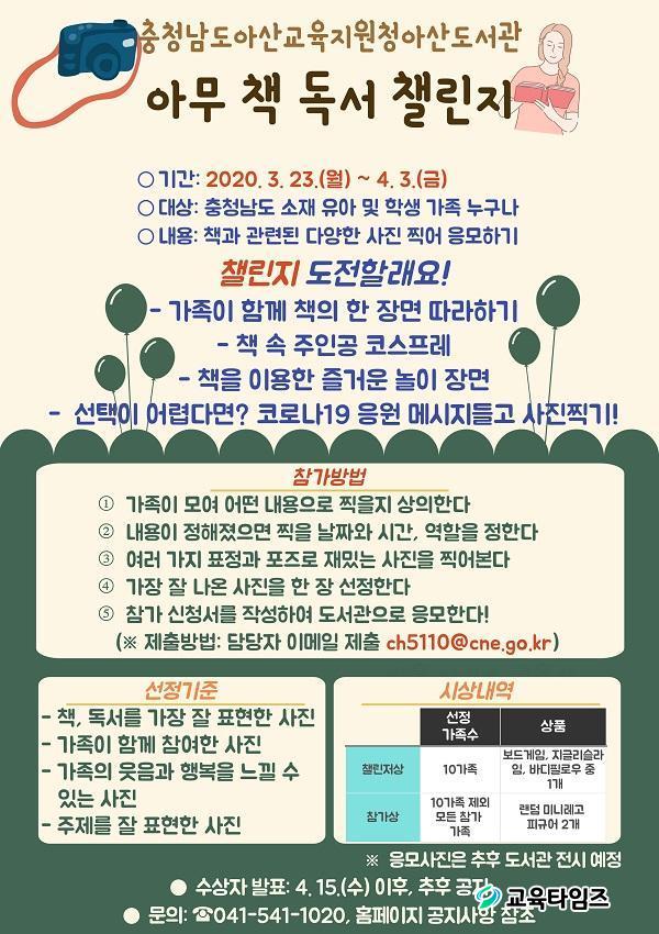 '2020 ¾Æ¹« Ã¥ µ¶¼ 縰Áö'´Â Ã¥°ú °ü·ÃµÈ ´Ù¾çÇÑ »çÁøÀ» Âï¾î ÀÀ¸ðÇÏ´Â °¡Á· ´ÜÀ§ À̺¥Æ®·Î ÃæÃ»³²µµ ¼ÒÀç À¯¾Æ ¹× Çлý °¡Á·À̶ó¸é ´©±¸³ª Âü¿©°¡ °¡´ÉÇÏ´Ù.