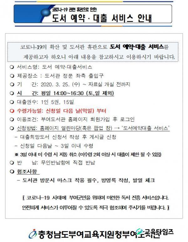 [ÃæÃ»±³À°½Å¹® = ÇѼºÁø ±âÀÚ] Ãæ³²ºÎ¿©±³À°Áö¿øÃ»ºÎ¿©µµ¼°ü(°üÀå ±èµµ¿¬)Àº Äڷγª-19 È®»ê ¹æÁö¸¦ À§ÇÑ Àӽà ÈÞ°üÀÌ Àå±âȵʿ¡ µû¶ó µµ¼¸¦ ¹Ì¸® ¿¹¾à ½Åû ÈÄ ´ÙÀ½³¯ ã¾Æ°¥ ¼ö ÀÖ´Â 'µµ¼ ¿¹¾à¡¤´ëÃâ ¼ºñ½º'¸¦ 25ÀϺÎÅÍ ½ÃÀÛÇß´Ù.