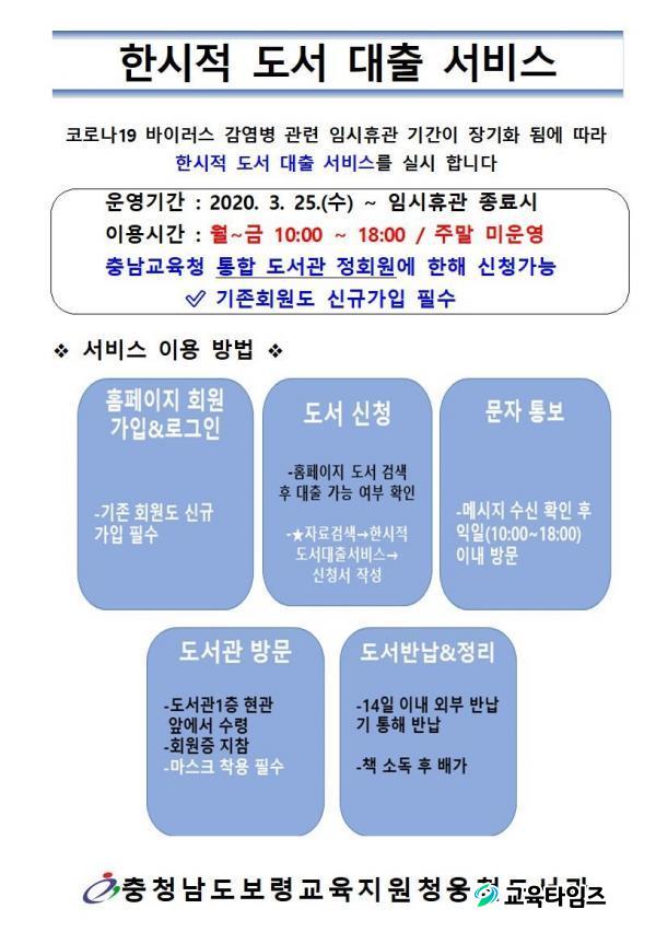 [ÃæÃ»±³À°½Å¹® = ÀÓÁ¾º¹ ±âÀÚ] ÃæÃ»³²µµº¸·É±³À°Áö¿øÃ» ¿õõµµ¼°ü(°üÀå ÀÌ°æ¾Æ)Àº Äڷγª19·Î ÀÎÇÑ µµ¼°ü ÀÓ½ÃÈÞ°üÀÌ Àå±âȵʿ¡ µû¶ó 25ÀϺÎÅÍ ÀÓ½ÃÈÞ°ü Á¾·á ½Ã±îÁö 'ÇѽÃÀû µµ¼´ëÃâ ¼ºñ½º'¸¦ ¿î¿µÇÑ´Ù.