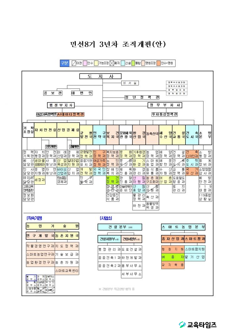 Á¶Á÷°³Æí¾È¿¡ µû¸£¸é, µµ º»Ã» ±â±¸´Â 13°³ ½Ç±¹(2±âȹ°ü Æ÷ÇÔ) 66°³ °ú¿¡¼ 15°³ ½Ç±¹(¡¨) 69°³ °ú·Î 2°³ ±¹ 3°³ °ú¸¦ È®´ë¡¤½Å¼³Çϰí, °Ç¼³º»ºÎÀå Á÷±ÞÀ» 3±ÞÀ¸·Î °Ý»óÇÒ ¿¹Á¤ÀÌ´Ù.