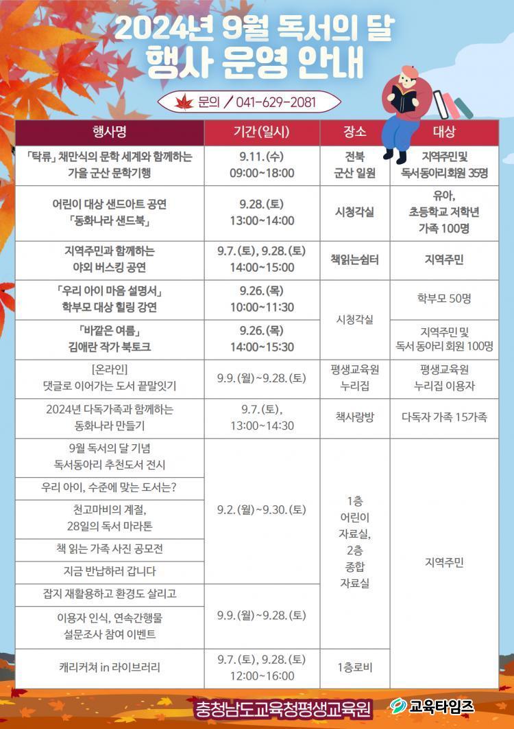 2024³â 9¿ù µ¶¼­ÀÇ ´Þ Çà»ç ¿î¿µ ¾È³» /»çÁø=ÃæÃ»³²µµ±³À°Ã»Æò»ý±³À°¿ø Á¦°ø