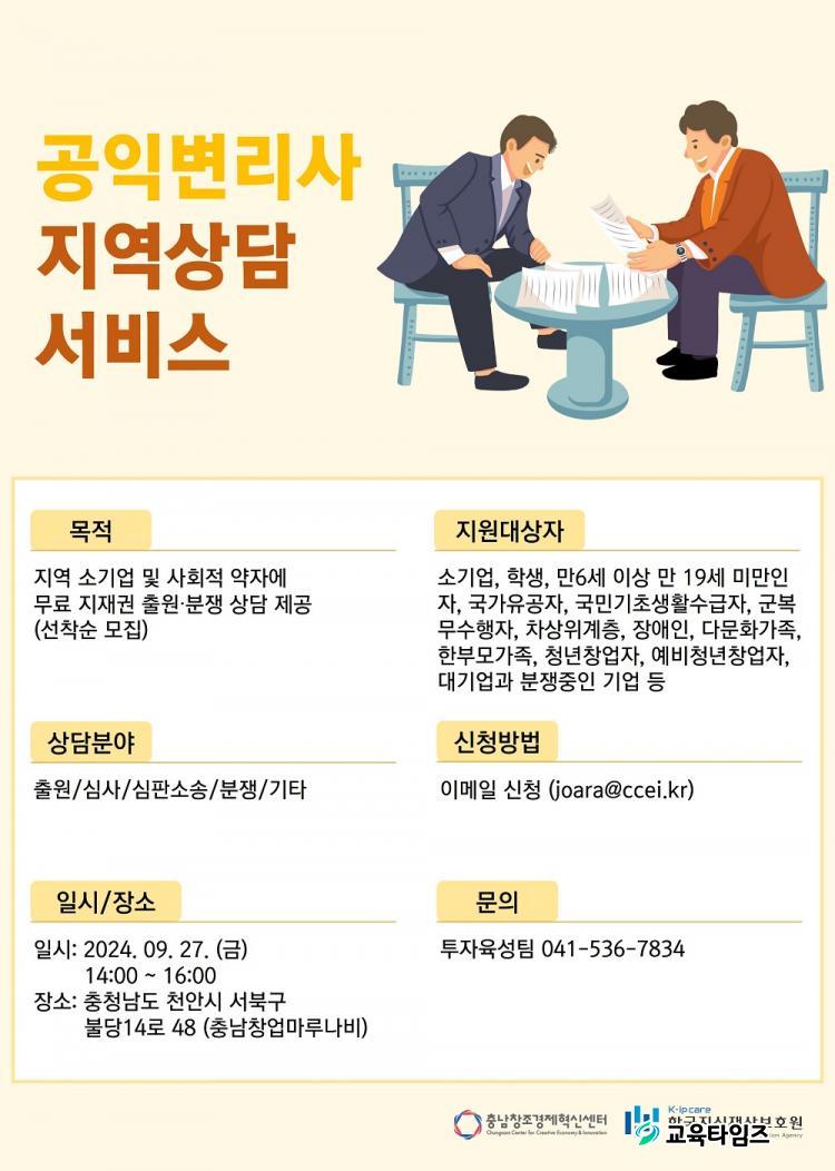 À̹ø ¼ºñ½º´Â Áö¿ª °æÁ¦ÀÇ È°¼ºÈ¿Í ÇÔ²² Ãæ³²Áö¿ªÀÇ Áö½ÄÀç»ê±Ç º¸È£ ¹× Ȱ¿ëÀ» ÃËÁøÇϱâ À§ÇÑ Ãæ³²¼¾ÅÍÀÇ Áö¼ÓÀûÀÎ ³ë·ÂÀÇ ÀÏȯÀÌ´Ù. Ãæ³²¼¾ÅÍ´Â º» ±âȸ¸¦ ÅëÇØ Áö¿ª ±â¾÷°ú â¾÷ÀÚµéÀÌ ´õ¿í Àü¹®ÀûÀÎ »ó´ãÀ» ¹Þ°í, Áö½ÄÀç»ê±ÇÀ» È¿°úÀûÀ¸·Î °ü¸® ÇÒ ¼ö ÀÖµµ·Ï Áö¿øÇÒ °èȹÀÌ´Ù.